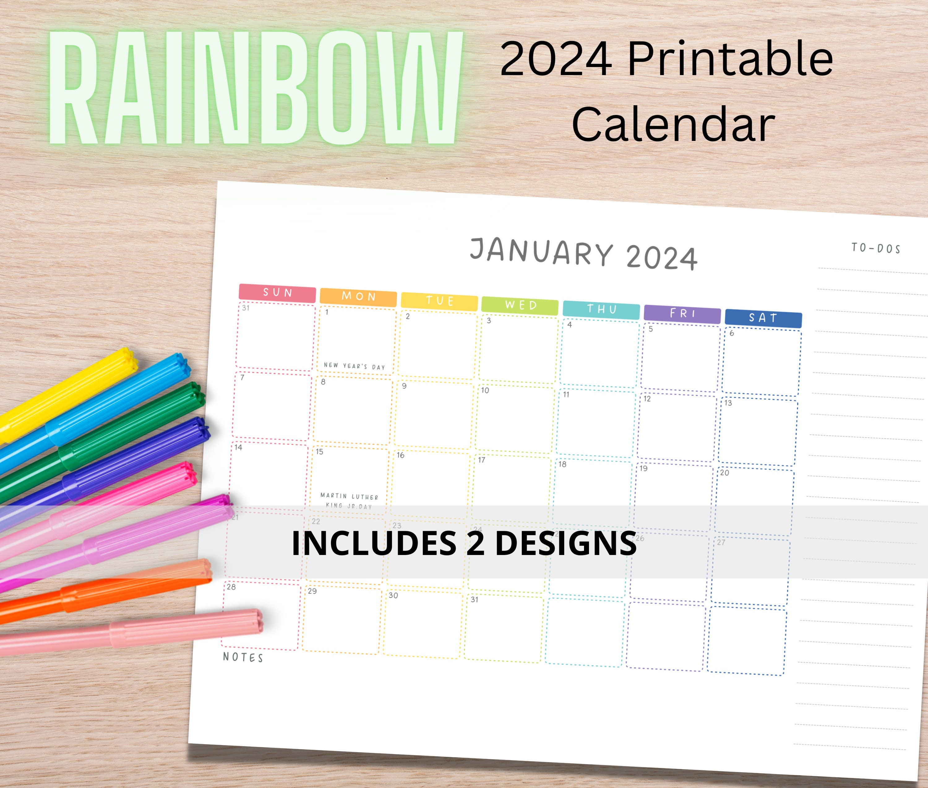 Printable Colorful Rainbow 2024 Monthly Calendar With to Do Etsy